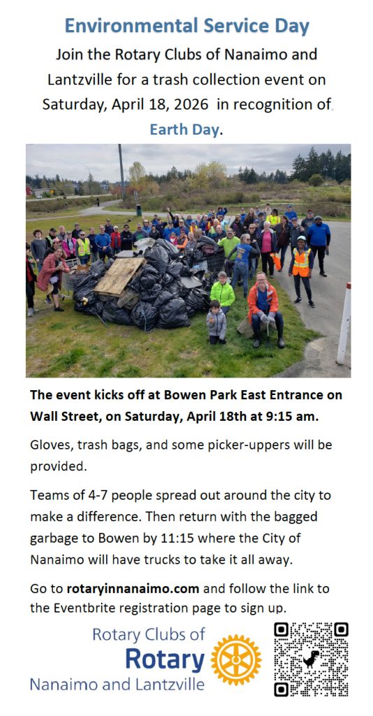 Members of the public are invited to take part in the Rotary Clubs of Nanaimo & Lantzville’s second annual clean up event to collect garbage from various sites around the city in recognition of Earth Day. Last year, we collected 2,100 pounds of garbage. Our goal is to exceed that amount this year but need your help to achieve that goal!