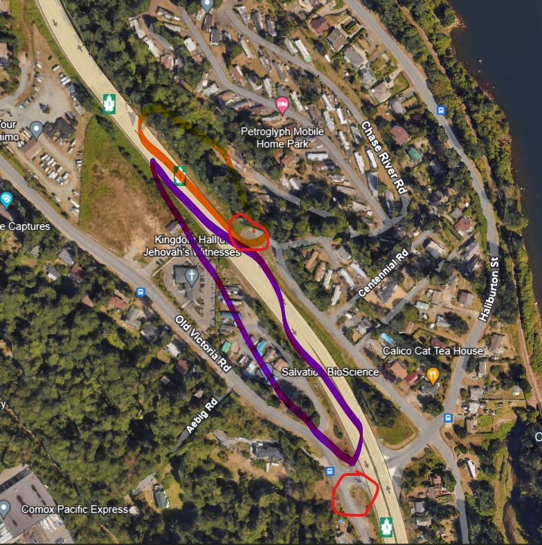 We will be picking up the SOUTHBOUND Island Highway from about 750 m north of Old Victoria Road (there are a couple pullovers) to Old Victoria Road. If there is a terrific turnout, we can split off and have team 2 park at the end of the side road north of the Calico Cat (Chase River Road although I’m not sure there is a sign…). They can work northbound.